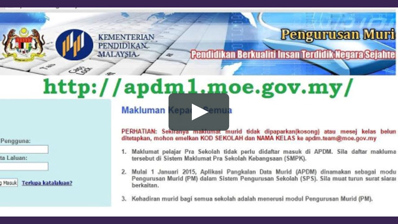 Kementerian Pendidikan Malaysia KPM telah melancarkan Aplikasi Pangkalan Data Murid Sistem APDM KPM sebagai langkah pengurusan murid secara efisien. Aplikasi Pangkalan Data Murid APDM adalah aplikasi secara online yang mengumpulkan database setiap murid di seluruh sekolah Malaysia. Di sebelah kiri ada bahagian Log Masuk Pengguna.